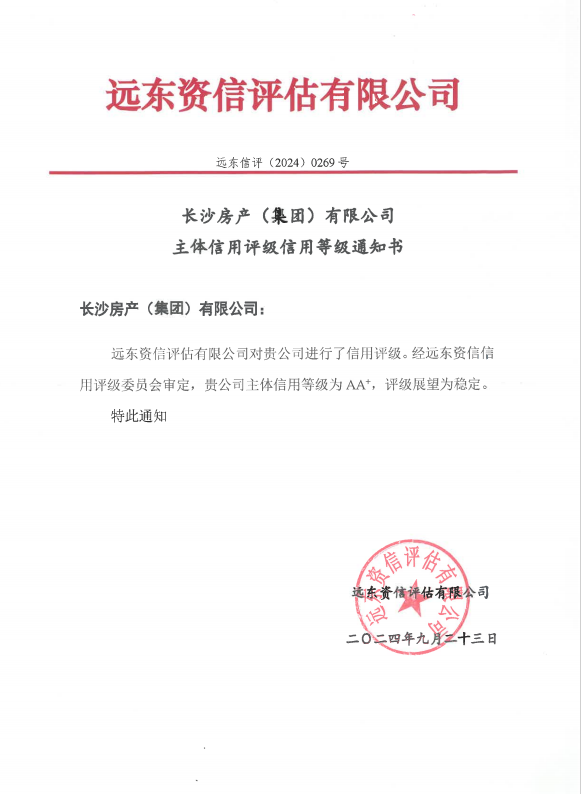 ??? 9月23日,經(jīng)評級(jí)機(jī)構(gòu)綜合審定,長沙房產(chǎn)(集團(tuán))有限公司獲評AA+主體信用等級(jí),評級(jí)展望為“穩(wěn)定”。主體信用評級(jí)是衡量企業(yè)現(xiàn)代化管理水平的標(biāo)尺,也是衡量企業(yè)財(cái)務(wù)能力的重要指標(biāo)體系。本次是長沙房產(chǎn)(集團(tuán))有限公司首次進(jìn)行主體信用評級(jí),AA+的信用等級(jí)表示其具有良好的信用資質(zhì)、穩(wěn)定的經(jīng)營狀況和廣闊的發(fā)展前景,也標(biāo)志著長沙房地產(chǎn)開發(fā)建設(shè)集團(tuán)有限公司(以下簡稱“長房集團(tuán)”)企業(yè)信用體系建設(shè)取得重大突破。